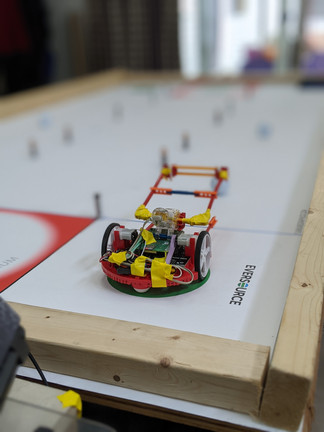 The first three challenges involved uploading videos of our robot completing tasks on the provided game mat, once in autonomous mode and once with driver-operated controls (teleop). Mondrian Madness involved navigating a single path through a maze inspired by the art of Dutch painter Piet Mondrian. Color Conundrum had us choose between two colored paths and deciding which we would run for our autonomous video and which we would run for our teleop video. Frantic Fetch provided golf balls to set out on the mat and bring back to home base.